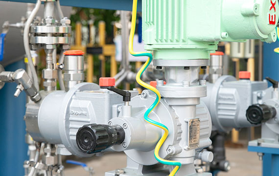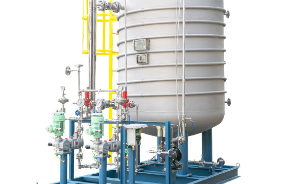 A complete-set device, composed of solution tank, metering pump, level gauge, safety valve, pulsation damper, all kinds of valves, pipes, electrical control cabinet, etc. installed on one iron base, is an integral combination achieving functions of chemical dissolving, preparation, metering and injection, and featuring a compact structure, a small size, easy transportation and installation. It can also be designed into various shapes based on dosing room space requirements of users.