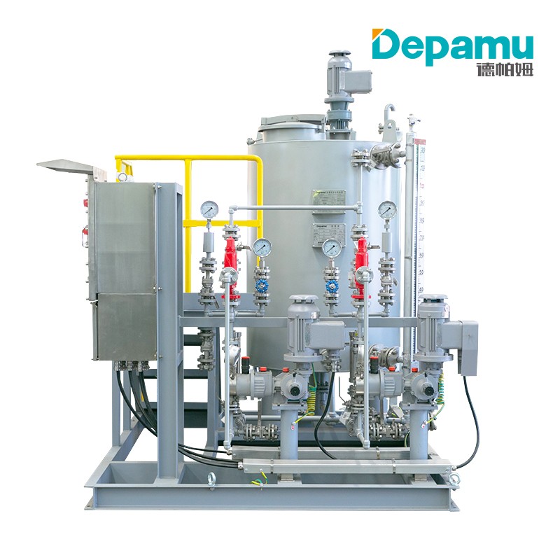 A complete-set device, composed of solution tank, metering pump, level gauge, safety valve, pulsation damper, all kinds of valves, pipes, electrical control cabinet, etc. installed on one iron base, is an integral combination achieving functions of chemical dissolving, preparation, metering and injection, and featuring a compact structure, a small size, easy transportation and installation. It can also be designed into various shapes based on dosing room space requirements of users.