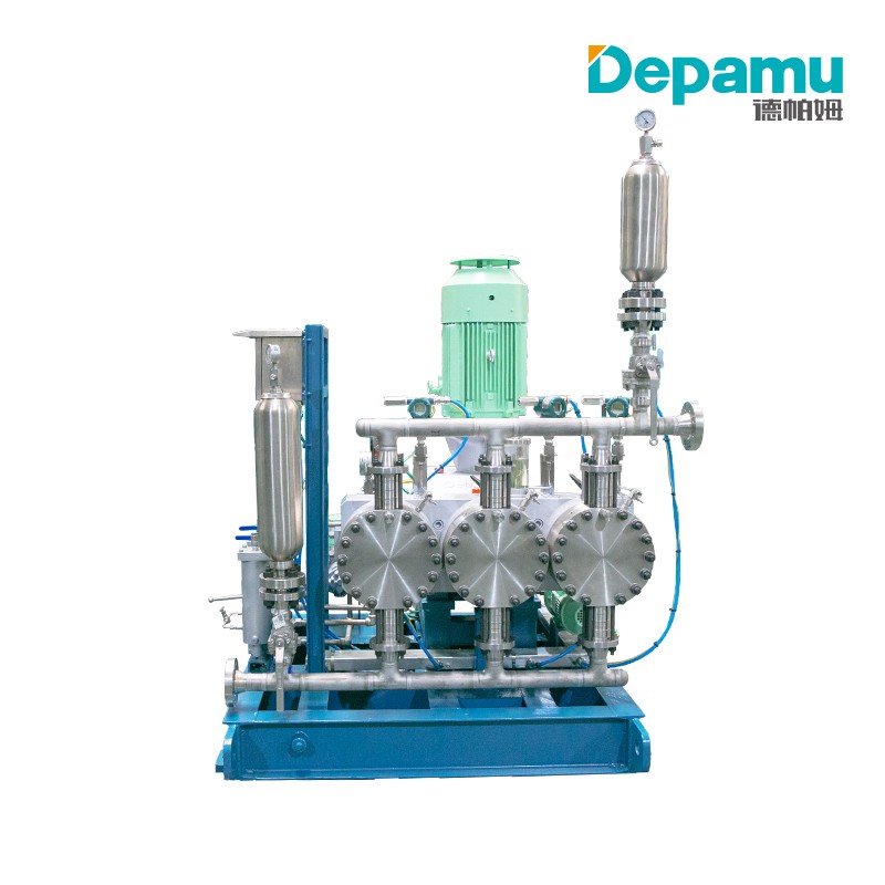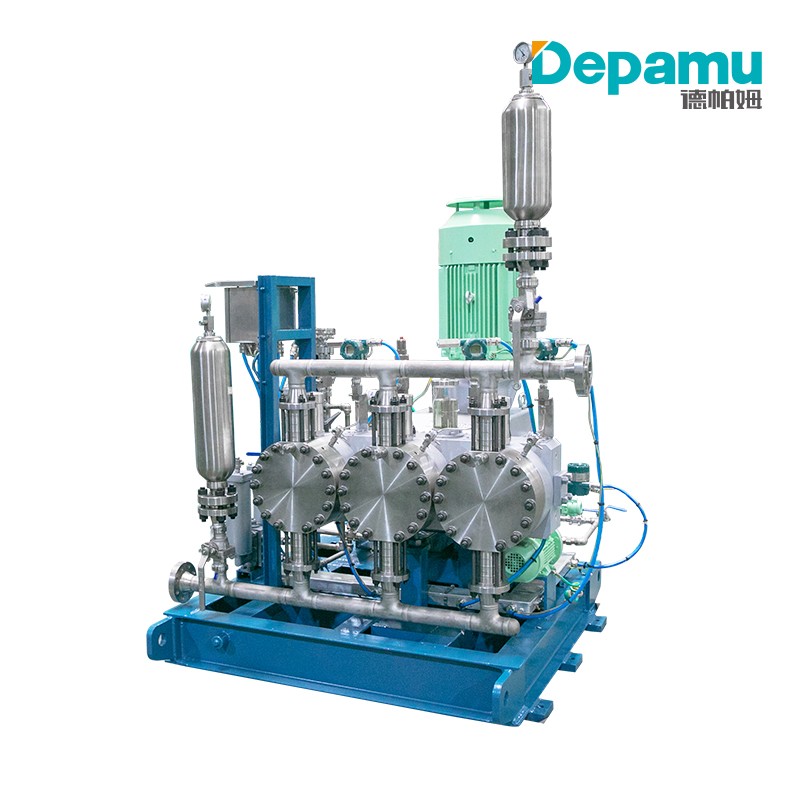 DEPAMU reciprocating pumps, designed as per American Petroleum Institute standard (API674), can represent quality at a worldwide leading level, and many patents the company has obtained can prove that. Products can meet extremely severe service conditions, transport materials accurately and reliably. Based on solid technologies, reciprocating pumps are especially popular in various fields. High-pres- sure plunger reciprocating pumps feature high efficiency, compact structure, stable performance, reliable and safe operation.