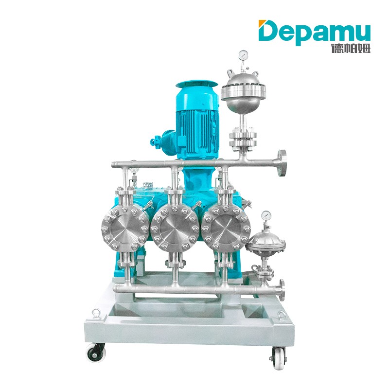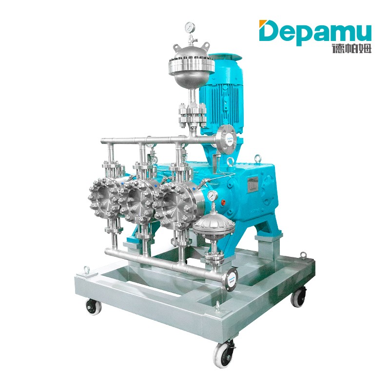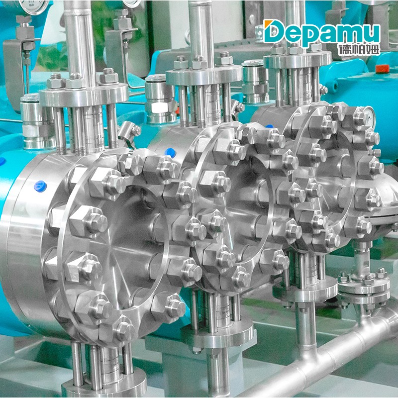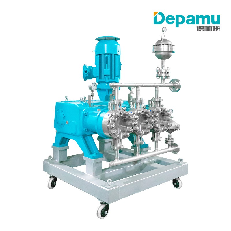DEPAMU reciprocating pumps, designed as per American Petroleum Institute standard (API674), can represent quality at a worldwide leading level, and many patents the company has obtained can prove that. Products can meet extremely severe service conditions, transport materials accurately and reliably. Based on solid technologies, reciprocating pumps are especially popular in various fields. High-pres- sure plunger reciprocating pumps feature high efficiency, compact structure, stable performance, reliable and safe operation.